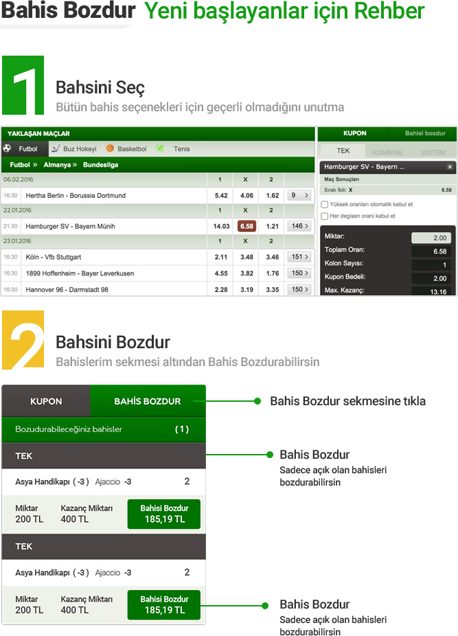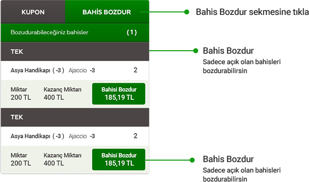 Bahis Bozdur sistemiyle sonuçları beklemeden kaderini kendin yazabilirsin! Bahisin kazanırken paranı alabilir, kârını garantileyebilirsin.